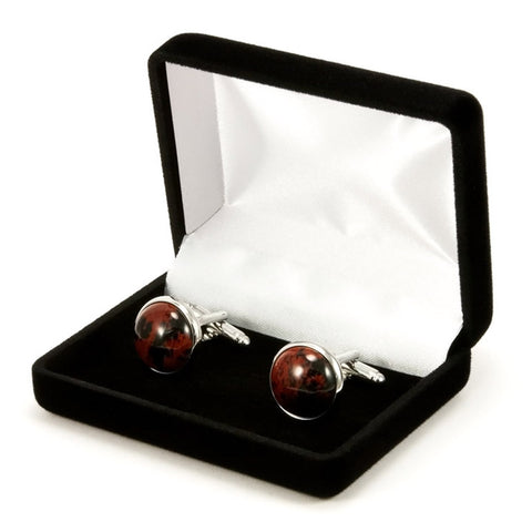 Extraordinary red obsidian silver cufflinks feature the distinctive colors of red and black. Red obsidian, also known as mahogany obsidian, is a natural glass obsidian that has iron inclusions creating the mahogany colored stripes and swirls.